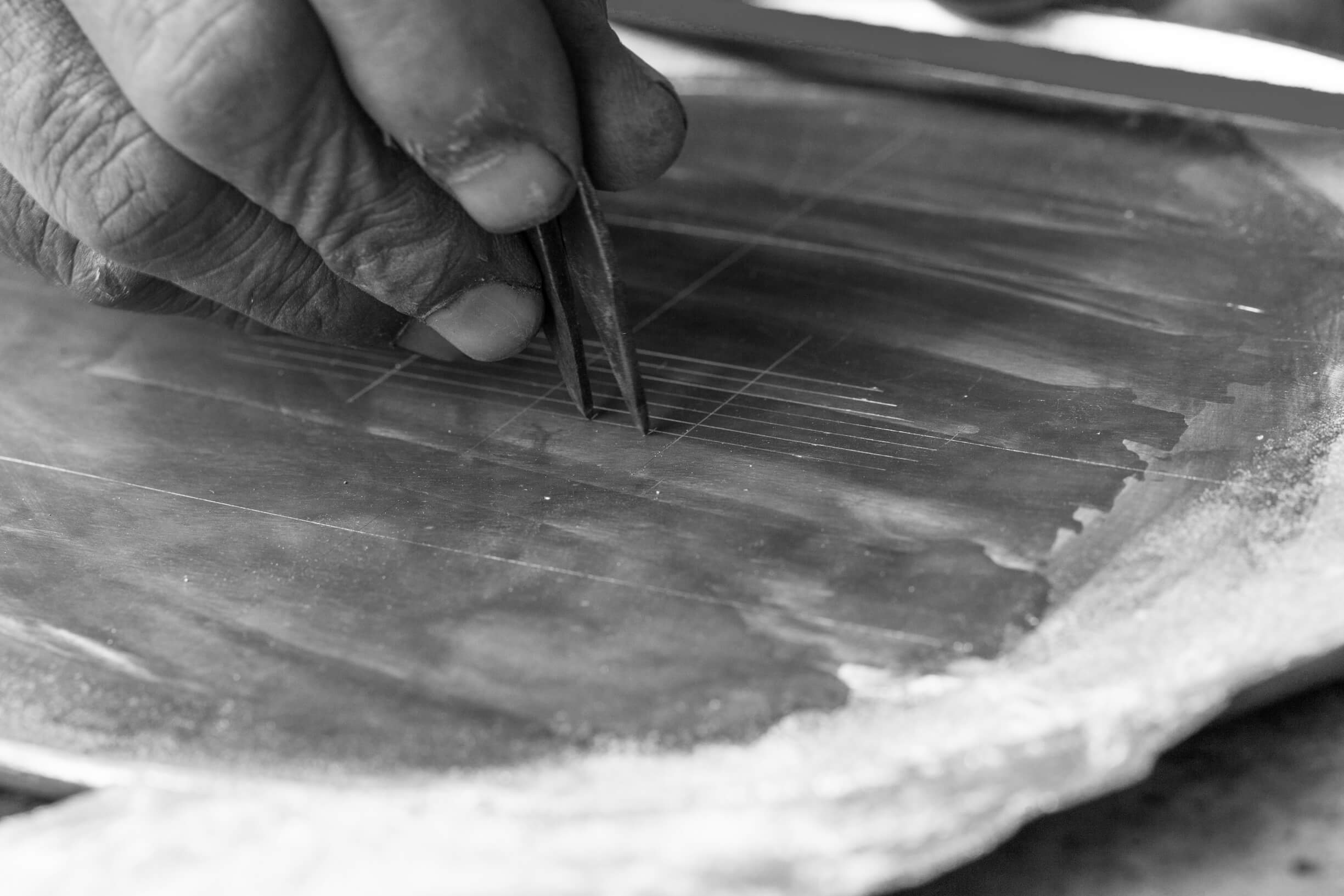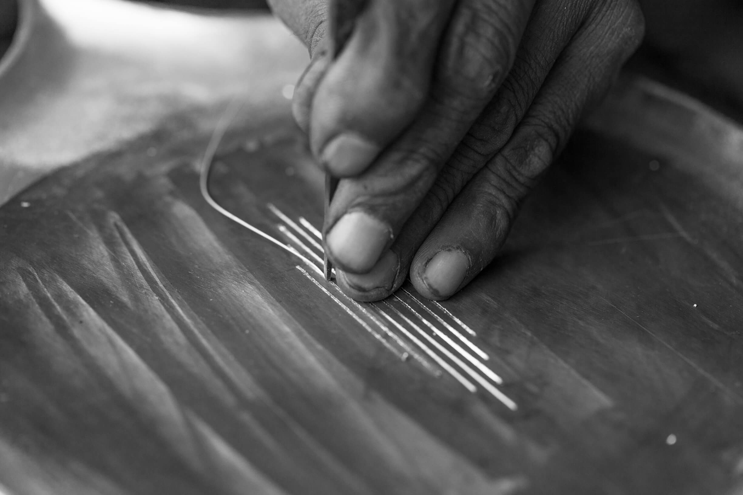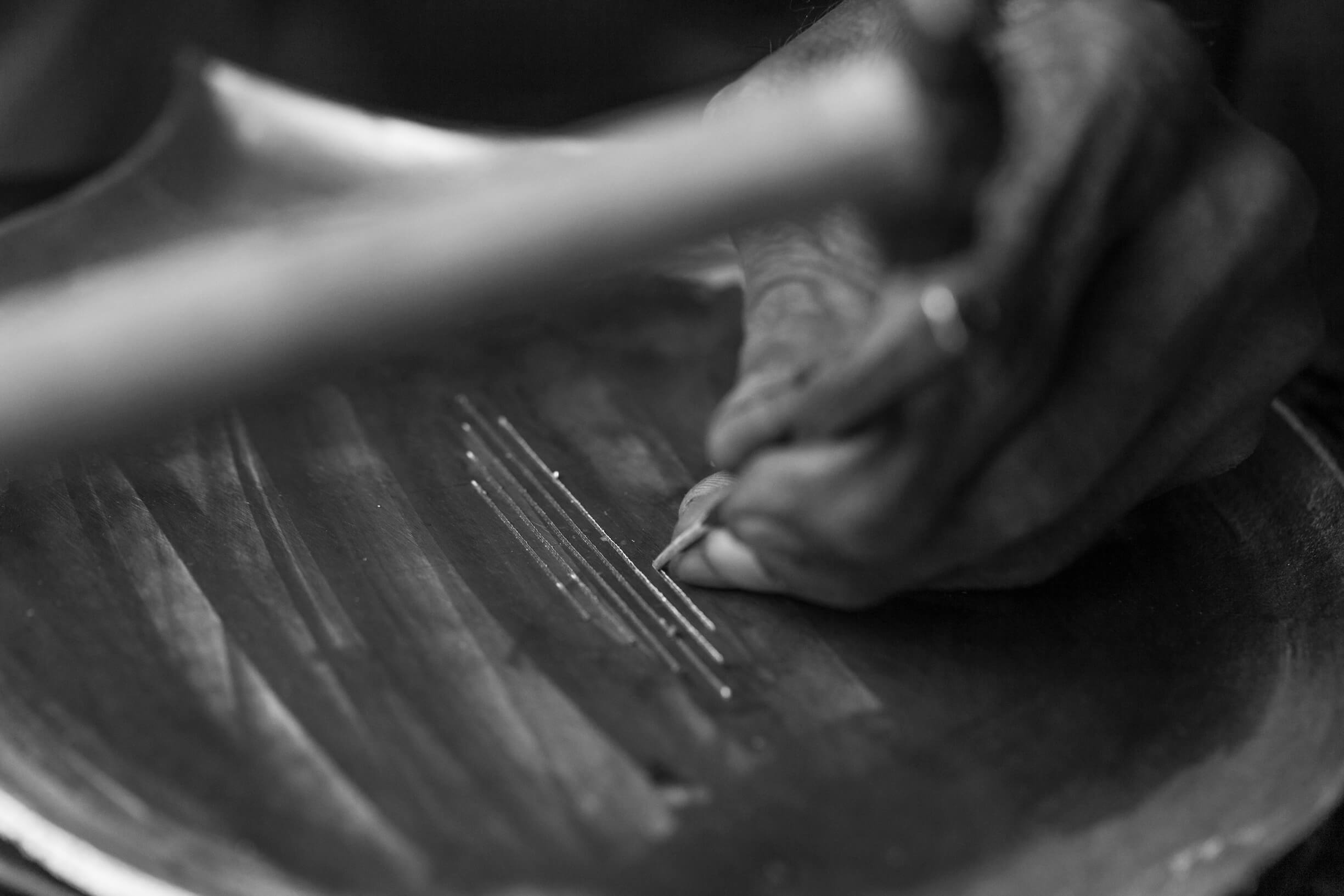 The base is hand-cast in an alloy of zinc and copper after which it is abrased and polished in preparation for the inlay. Using fine chisels the pattern is engraved and the silver is deftly inlaid on to the base of the tray employing a technique known as Tarkashi.