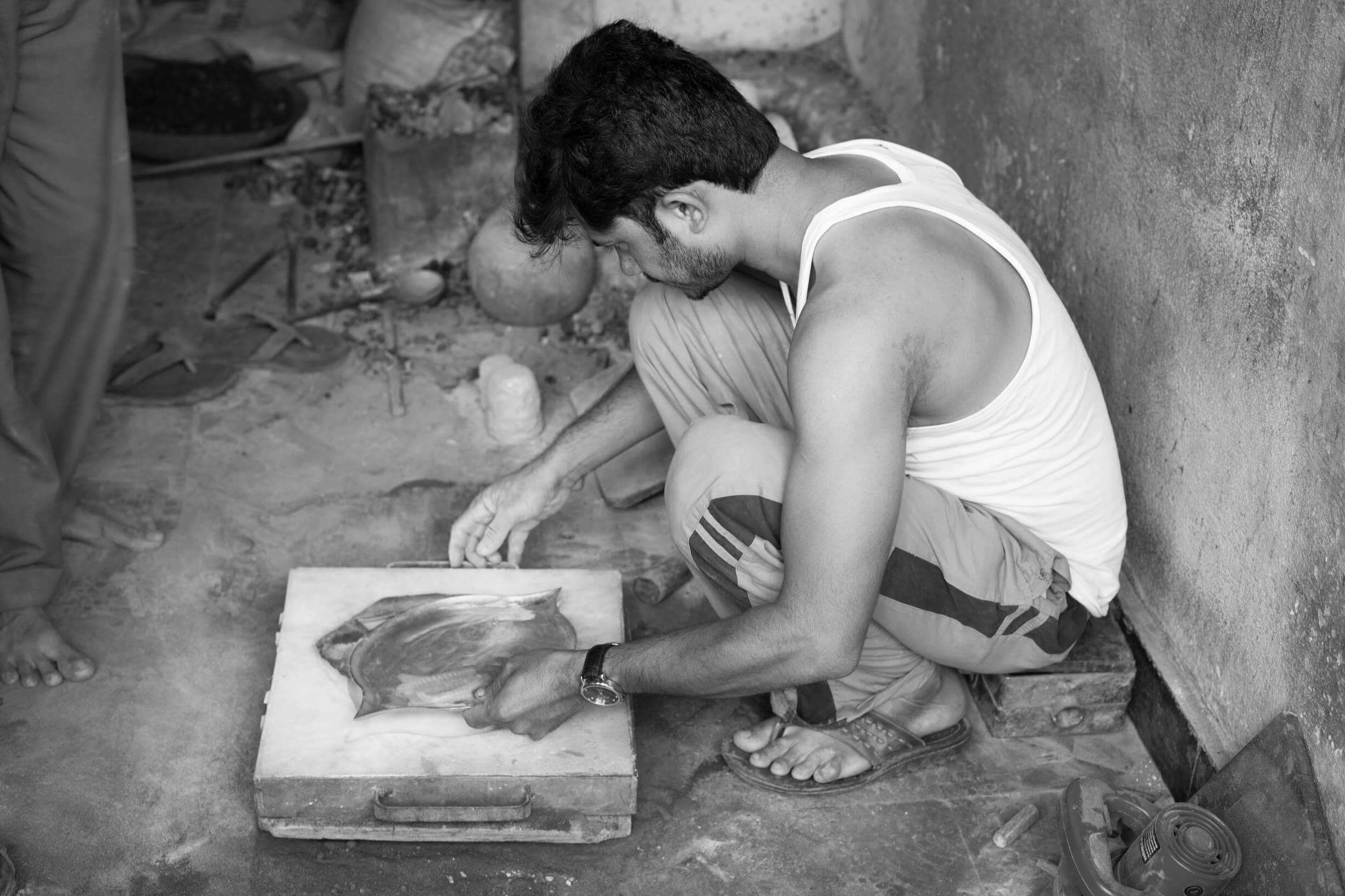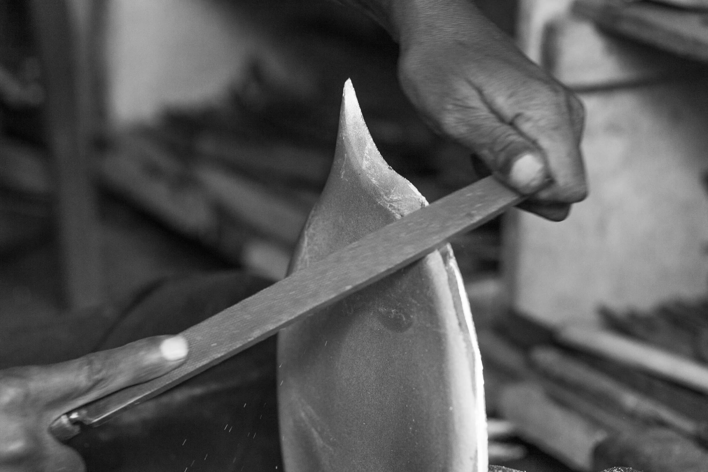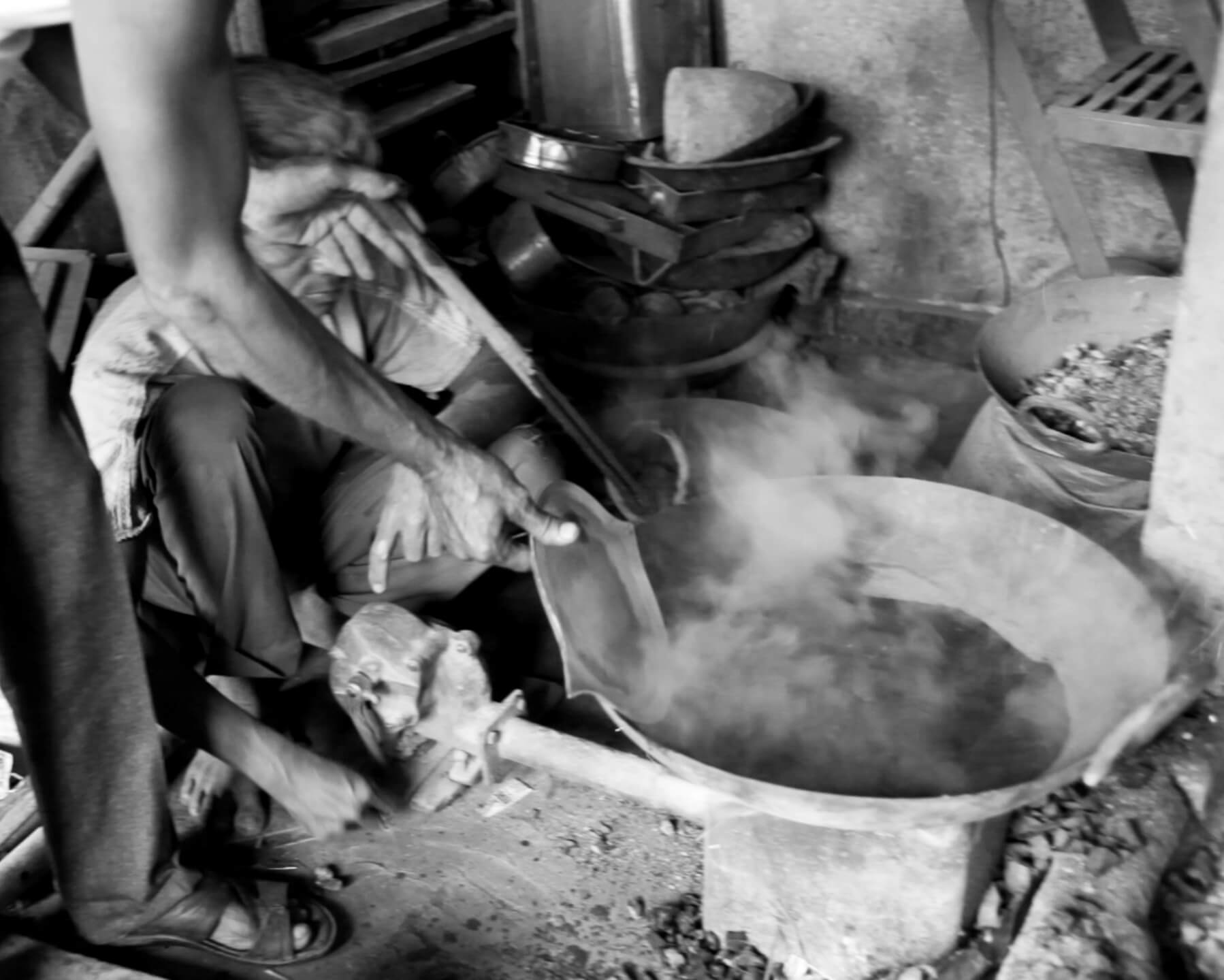 The base is hand-cast in an alloy of zinc and copper after which it is abrased and polished in preparation for the inlay. Using fine chisels the pattern is engraved and the silver is deftly inlaid on to the base of the tray employing a technique known as Tarkashi.