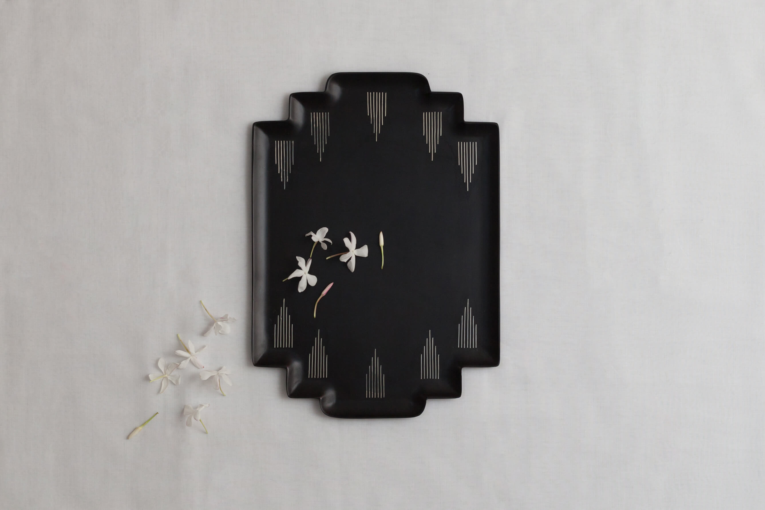 The first series of our Bidri collection draws on rich, historical inspirations of art, architecture, and craft from the Mughal, and Bahmani dynasties. Agra and Fatehpur, two striking trays in two distinct designs have been crafted using Bidri techniques bringing together expressions of the past and present.